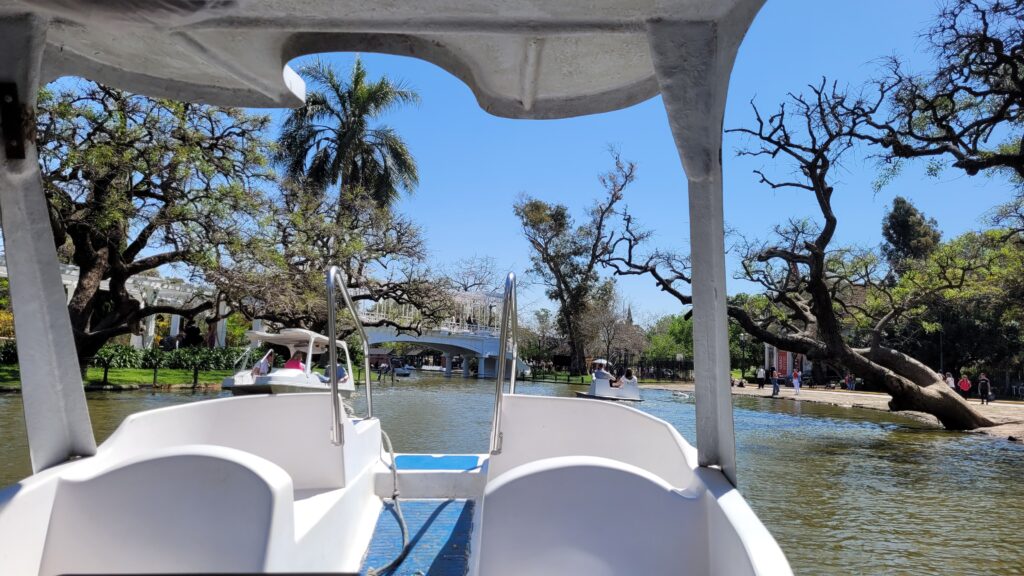 Em outro dia nós voltamos e alugamos um dos pedalinhos para darmos uma volta no lago, que é maior do que parece, então preparem as pernas… Existem diferentes tamanhos de pedalinho para se alugar lá, podendo ser até ser para até 06 pessoas e com capota. O local é muito bonito mesmo, tem uma vista privilegiada do Rosedal de Palermo e os patinhos nadando dão um charme no passeio também. Com certeza essa é uma das experiências mais diferentes que fizemos por lá e adoramos, certamente faríamos mais e mais vezes caso morássemos por perto.