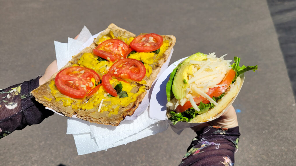 Nas barraquinhas tinham tequeños, hambúrgueres, pizzas e claro, como estamos na Argentina, muitas empanadas e alfajores. Nos aproximamos e nos surpreendemos com a quantidade de itens veganos (era uma surpresa ao perguntar se eram veganos e escutar um “sim”). Enfim, resolvemos escolher algumas das barraquinhas para estreamos e acabamos comprando uma pizza da pizzabaella_ok. O dono foi super simpático e nos contou sobre as tradições da família de origem italiana e tudo.  Falando do sabor, estava muito gostosa, com bastante queijo, e tinha um formato bem prático para se comer na rua, meio que uma pizza romana (retangular). A massa tinha uma crocância bem boa, já que as bordas eram assadas 360 (diferente de uma fatia de pizza), já o interior era bem molhadinho e saboroso por causa do queijo e do tomate. Para “acompanhar” compramos também os bem vistosos pãezinhos de milho de origem colombiana e venezuelana chamados de arepas, é tipo uma massa de broa em formato de tapioca, recheado com tomate, alface, cebola, abacate e queijo, mas podem ver que o recheio é BEM caprichado….